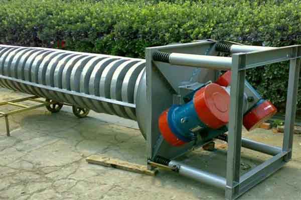 - ZC垂直振動輸送機的驅(qū)動裝置振動電機安裝在輸送塔下部,兩臺振動電機對稱交叉安裝,輸送塔由管體和焊接在管體周圍的螺旋輸送槽組成,輸送塔座于減振裝置上,減振裝置由底座和隔振彈簧組成。